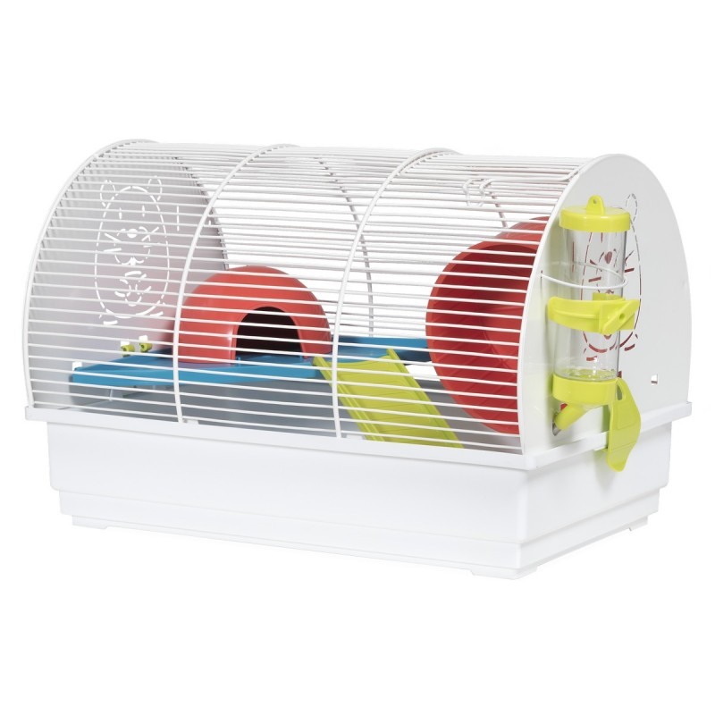 Клетка небольшого размера подходит для хомяков с декоративным рисунком по бокам. Изготовлено в Испании, с использованием эпоксидной краски без свинца и пластика, полипропилена, не токсична. В комплекте колесо, угловая полка, лесенка и домик. Размер: 39.00 x 25.50 x 27.00 см. Вес: 1.47кг. Расстояние между прутьями 7мм.