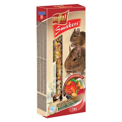 Поможет дегу сточить постоянно растущие зубы. Простая добавка сделана из любимых природных ингредиентов вашего животного, а её великолепный вкус позволит использовать лакомство для тренировок. Состав: фрукты - 44%, зёрна - 18%, выпечка - 38%. Анализ: Сырой протеин 16%, Сырая клетчатка 11%, Сырой жир 7%, Сырая зола 3,9%. Содержит натуральные витамины. Производитель: Польша.