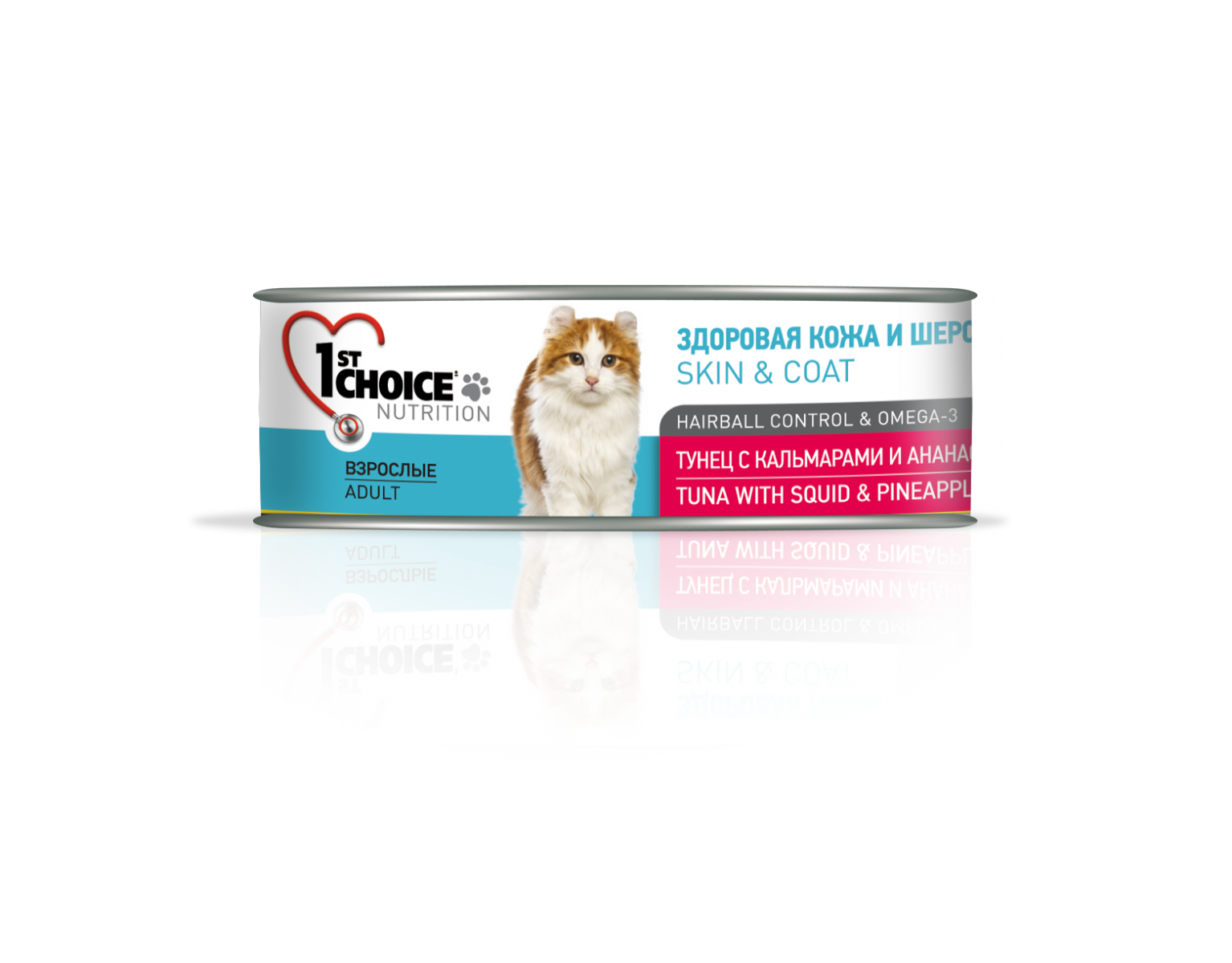 Вкусное консервированное питание 1st CHOICE для кошек обеспечивает здоровую и красивую шерсть, благодаря высокому содержанию Омега-3 и эффективную систему вывода шерсти и контроля образования волосяных комочков (содержит ананас).