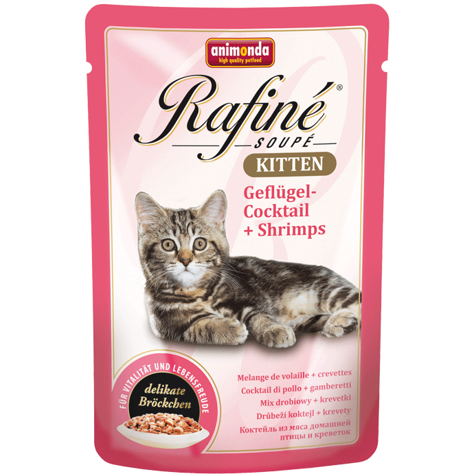 Rafine Soupe Kitten (Птица, Креветки) - Полнорационный консервированный корм для котят. Нежные и вкусные маленькие кусочки мяса с изысканными добавками в паучи по 100 гр.