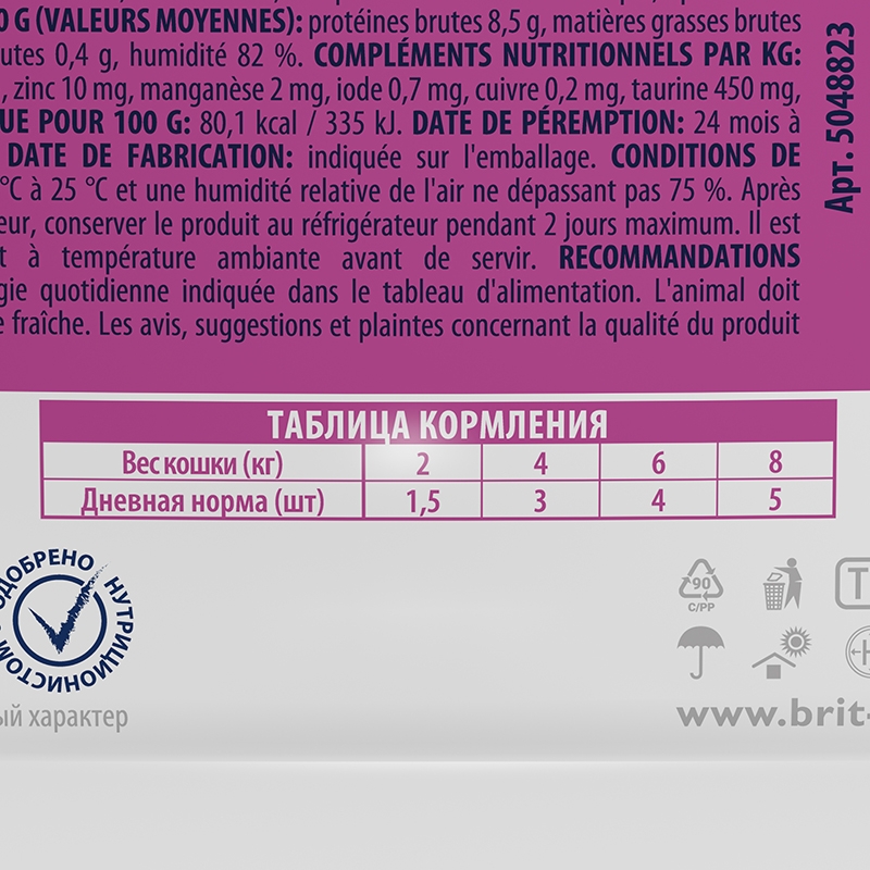 Питательные добавки на 1 кг: витамин D3 250 МЕ, витамин Е 100 мг, цинк 10 мг, марганец 2 мг, йод 0,7 мг, медь 0,2 мг, таурин 450 мг, биотин 0,1 мг.