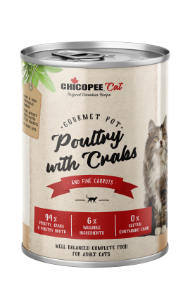 Chicopee заботится о наличии свежих овощей в составе для хорошего самочувствия и жизненной силы вашего питомца.Состав: 45% птицы (смесь мяса, печени, шеи), 26% бульон из птицы, 26% Крабы, 4% Морковь, 1% рисовая мука, 1% минералов.Аналитические составляющие