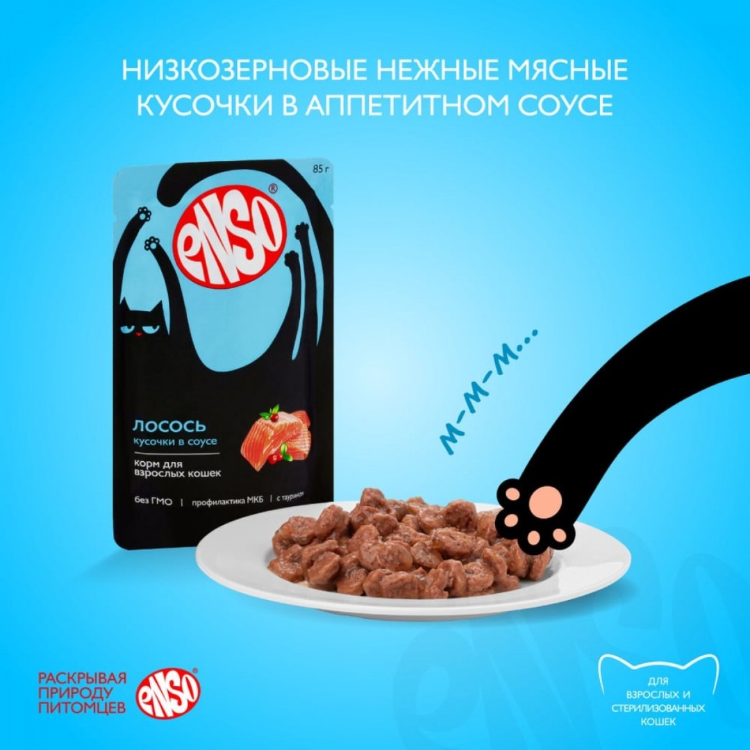 ENSO® c лососем для взрослых и стерилизованных кошек обогащен биоактивным комплексом – функциональными добавками, необходимыми для поддержания здоровья питомцев: