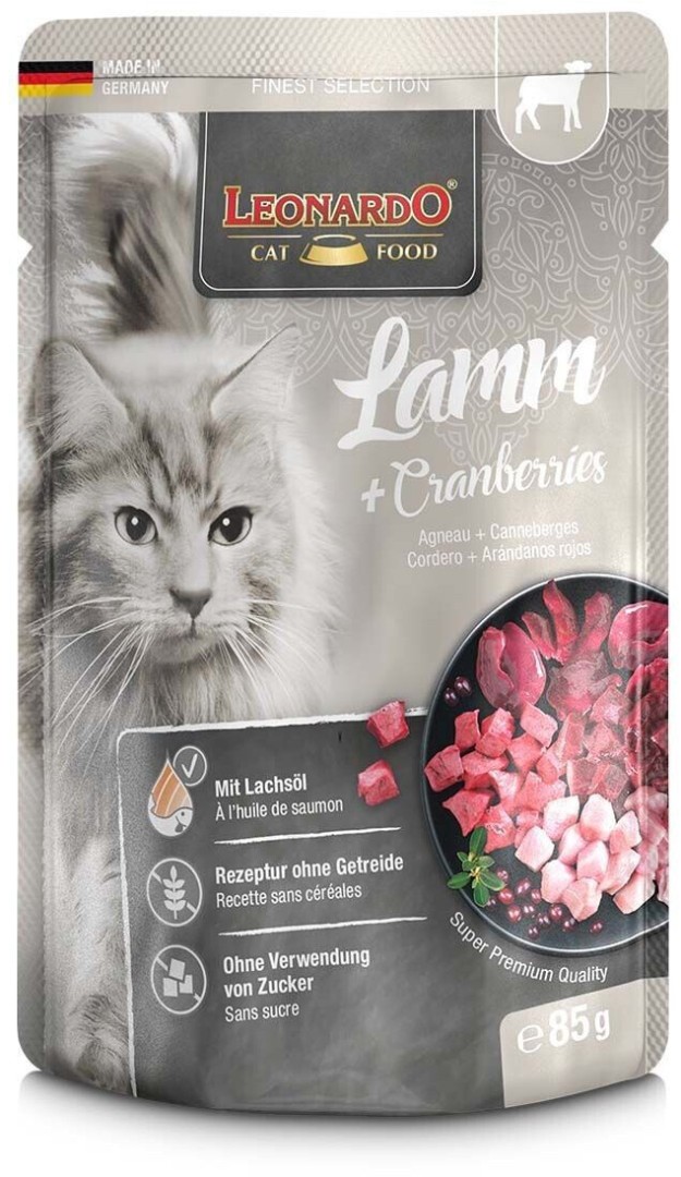 Это сочетание легкоусвояемой баранины, лучшего мяса птицы и красных ягод особенно подходит для гурманов, а также для чувствительных желудков кошек. Клюква полна антиоксидантов и витаминов. Также превосходно: LEONARDO Lamb + Cranberries содержит лососевое масло, обеспечивающее полиненасыщенные жирные кислоты для блестящей шерсти.