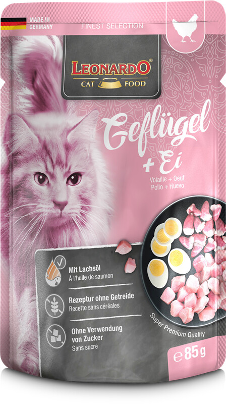 Leonardo Poultry+Egg - это пресервы супер-премиум класса, созданные специально для взрослых кошек с мясом птицы и яйцом. Нежное мясо, входящее в состав, не подвергалось заморозке, а потому сохранило множество полезных веществ.