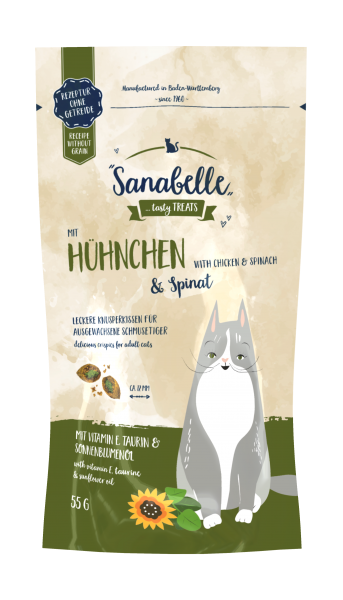 Лакомство Sanabelle Crispies with Chicken & Spinach содержит большое количество белка животного происхождения и великолепно подходит как дополнительное питание или поощрение кошек. Лакомство насыщено питательными веществами и минералами, позволяет кошкам получать дополнительную энергию и питательные вещества. Особый состав лакомства благоприятно влияет на шерсть и кожу кошки. Благодаря оптимальной структуре и высокому содержанию мясных компонентов, обладает великолепными вкусовыми качествами.