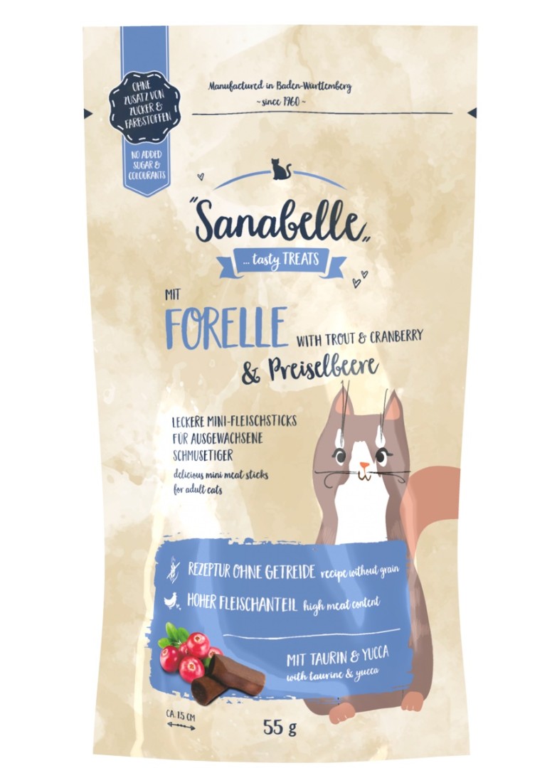 Лакомство Sanabelle CAT STICKS TROUT & CRANBERRY содержит больше количество белка животного происхождения и великолепно подходит как дополнительное питание или поощрение кошек. Лакомство насыщено питательными веществами и минералами, позволяет кошкам получать дополнительную энергию и питательные вещества. Особый состав лакомства благоприятно влияет на шерсть и кожу кошки. Благодаря полувлажной структуре и высокому содержанию мясных компонентов, обладает великолепными вкусовыми качествами.
