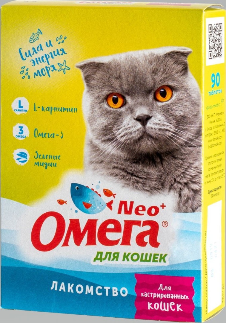 Мультивитаминное лакомство Омега Neo+ предназначено для поощрения, баловства, дрессировки и поддержания здорового и поддержания здоровья кастрированных кошек.
