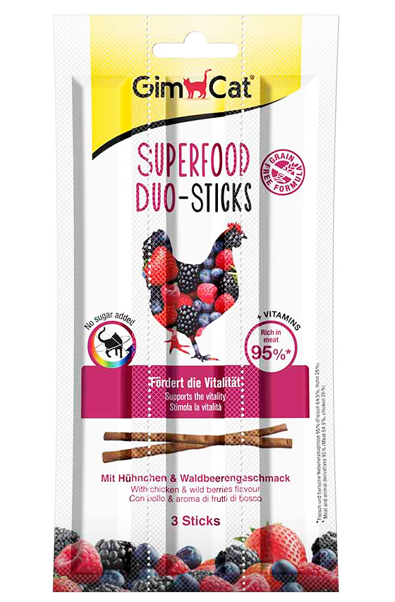 Лакомство для кошек GIMBORN GimCat Superfood цыпленок и ягоды 3 штуки - это идеальная комбинация цыпленка и полезных функциональных ингредиентов. Лесные ягоды известны своими антиоксидантными свойствами и другими важными свойствами. В упаковке 3 палочки.