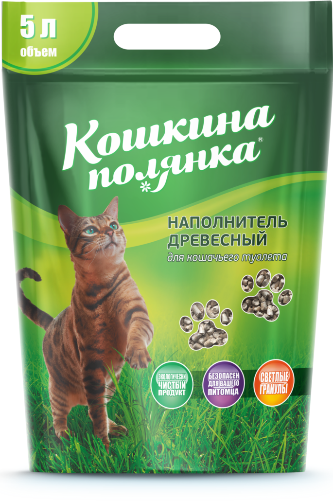 - Древесный гранулированный наполнитель “Кошкина полянка”— органический продукт, изготовленный из высококачественной древесины хвойных пород с минимальным содержанием коры, обладает приятным ароматом и золотистым цветом.