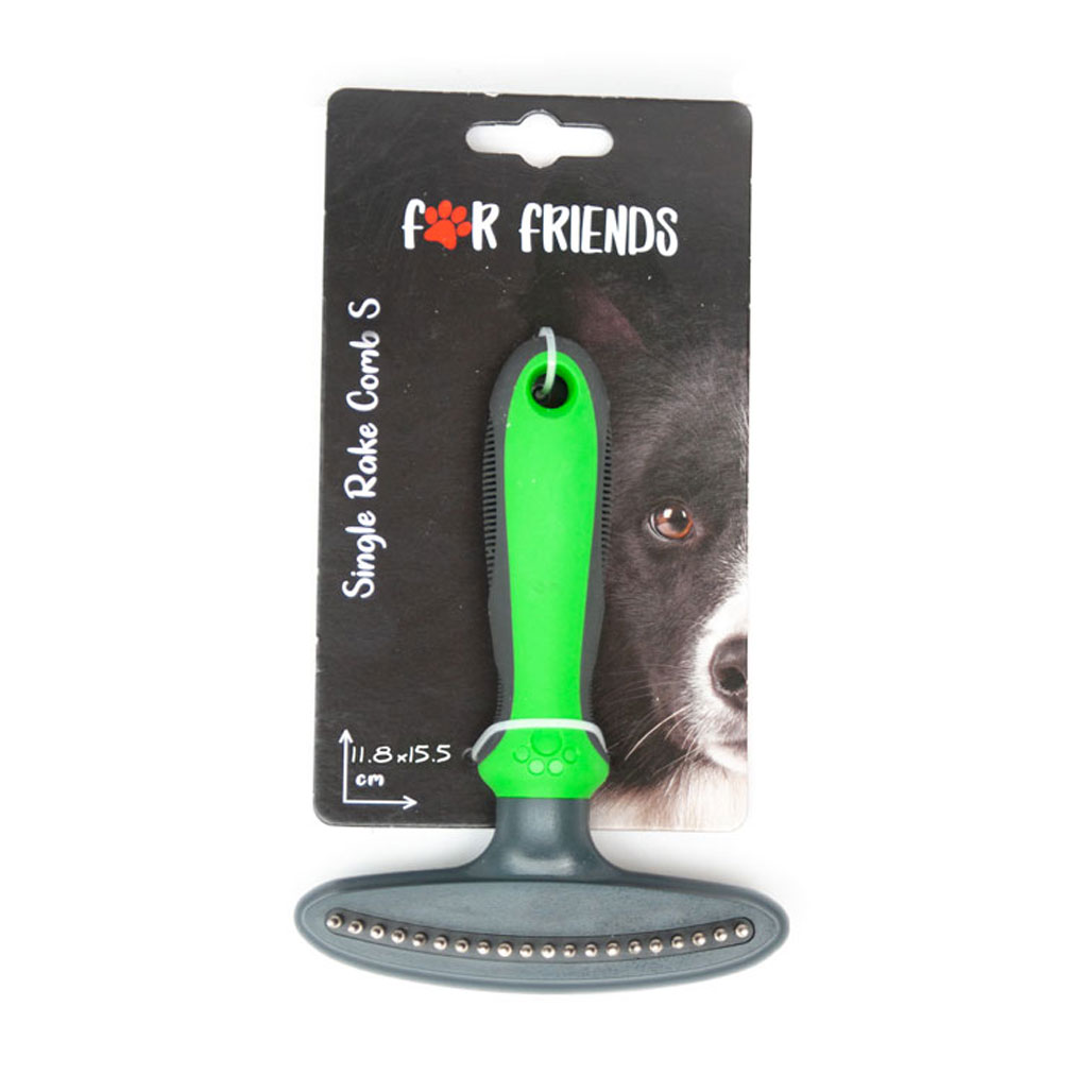 Прочная и удобная однорядная расческа-грабли с металлическими зубьями. За счет зауженных зубьев глубоко проникает в шерсть, при этом не повреждает кожу и остевой волос. Отлично вычесывает шерсть, придает ухоженный вид. Подходит для котов и собак с длинной шерстью в качестве финального груминга. Пластиковая ручка с резиновыми вставками. Материал: пластик, металл, резина. Размер: S 11.8*15.5 см и L 14.6*16.8 см