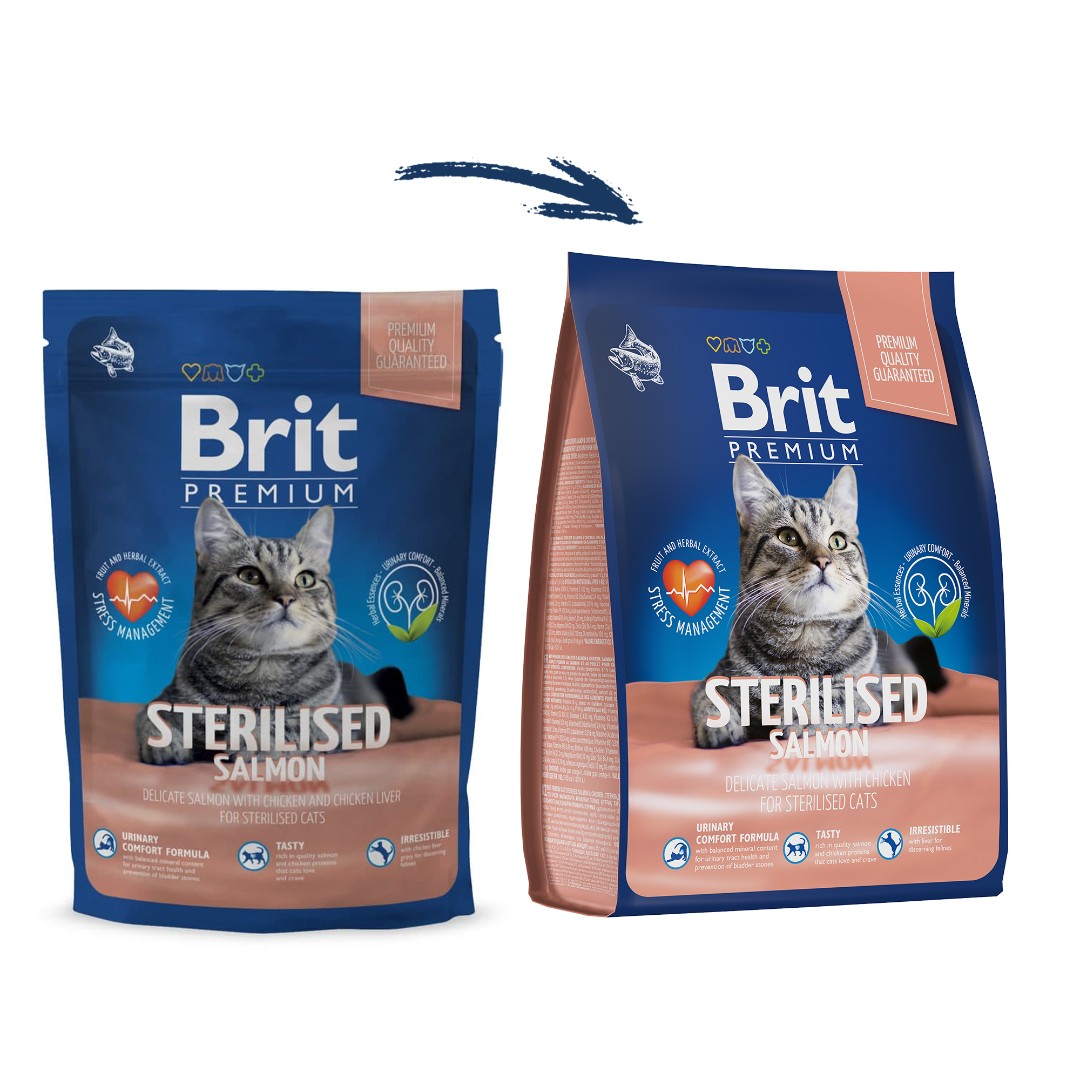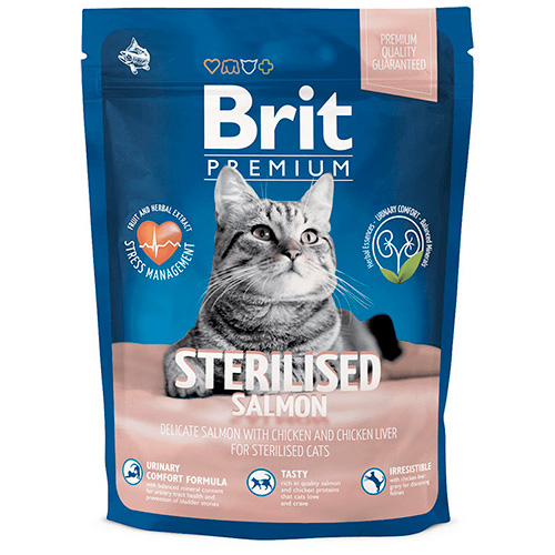 Brit Premium Sterilised Salmon& Chicken. Полнорационный сухой корм премиум класса с лососем и курицей для взрослых стерилизованных кошек.