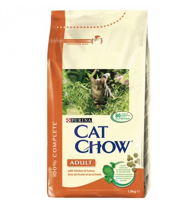 Содержащий большое количество домашней птицы, утки или лосося, полноценный и сбалансированный, корм Cat Chow® Adult включает также комплекс Naturium – особое сочетание волокон природного происхождения, поддерживающий здоровье пищеварительной системы.