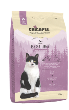 Chicopee CNL SENIOR BEST AGE для пожилых котов - полноценное питание для кошек старше 8 лет, способствующее улучшению пищеварения, здоровью и долголетию животного. Данный корм подходит для домашних пожилых котов и котов с чувствительным пищеварением.