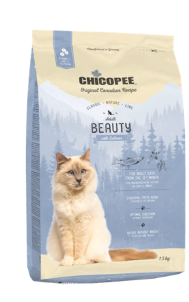 Chicopee CNL BEAUTY с лососем - полноценное питание для взрослых кошек, способствующее улучшению пищеварения, здоровью и долголетию животного.