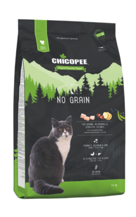 Chicopee HNL NO GRAIN беззерновой - полноценное питание для взрослых котов, способствующее улучшению пищеварения, здоровью и долголетию животного. Данный корм подходит для домашних котов и котов с чувствительным пищеварением.
