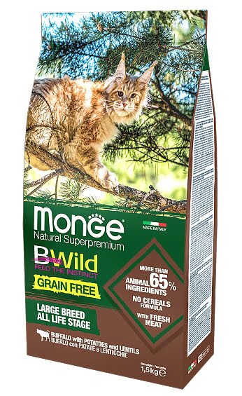 Monge BWild Cat Grain Free Large Byffalo with Potatoes and Lentils - беззерновой полноценный сбалансированный корм из мяса буйвола для крупных кошек всех возрастов.