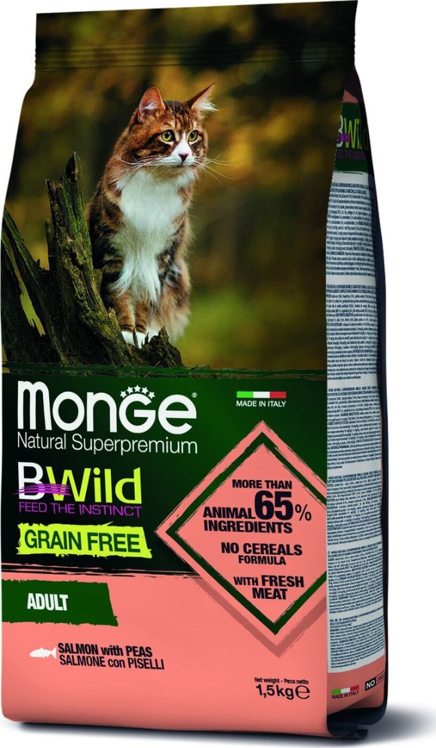 Monge Cat Bwild Grain Free (Лосось) - это полноценный сбалансированный рацион из трески с добавлением альтернативных источников углеводов, таких как: картофель и чечевица, для взрослых кошек.