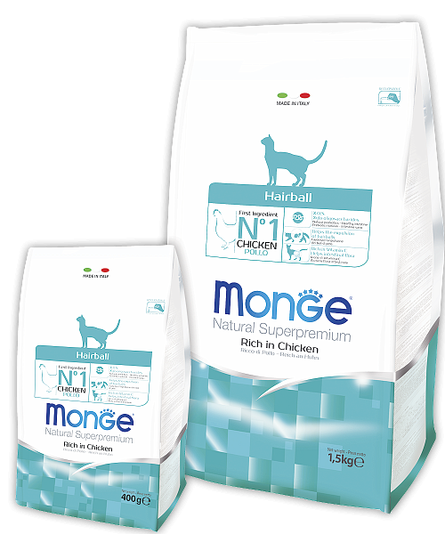 Корм для выведения шерсти из желудка. MONGE SUPERPREMIUM CAT HAIRBALL - это полноценный сбалансированный рацион для взрослых домашних кошек, часто страдающих от скопления комков шерсти в желудке. Высокий уровень белка в составе корма и содержание в нем L-карнитина позволяют кошке долгие годы сохранять активность и хорошую физическую форму.