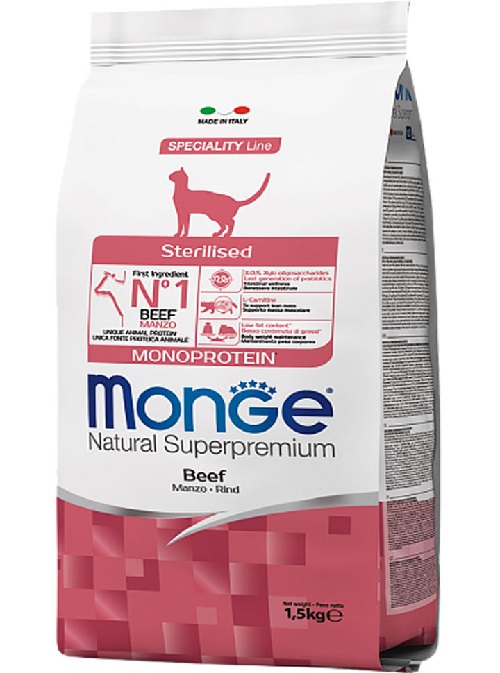 Monge Cat Monoprotein Sterilised MANZO (говядина) - это монопротеиновый корм с говядиной для взрослых стерилизованных кошек и кастрированных котов.