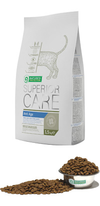 С целью удовлетворения потребности рынка в таком продукте был создан корм нового типа NATURE‘S PROTECTION SUPERIOR CARE ANTI AGE – это ключ к увеличению продолжительности жизни и жизнеспособности кошек.•