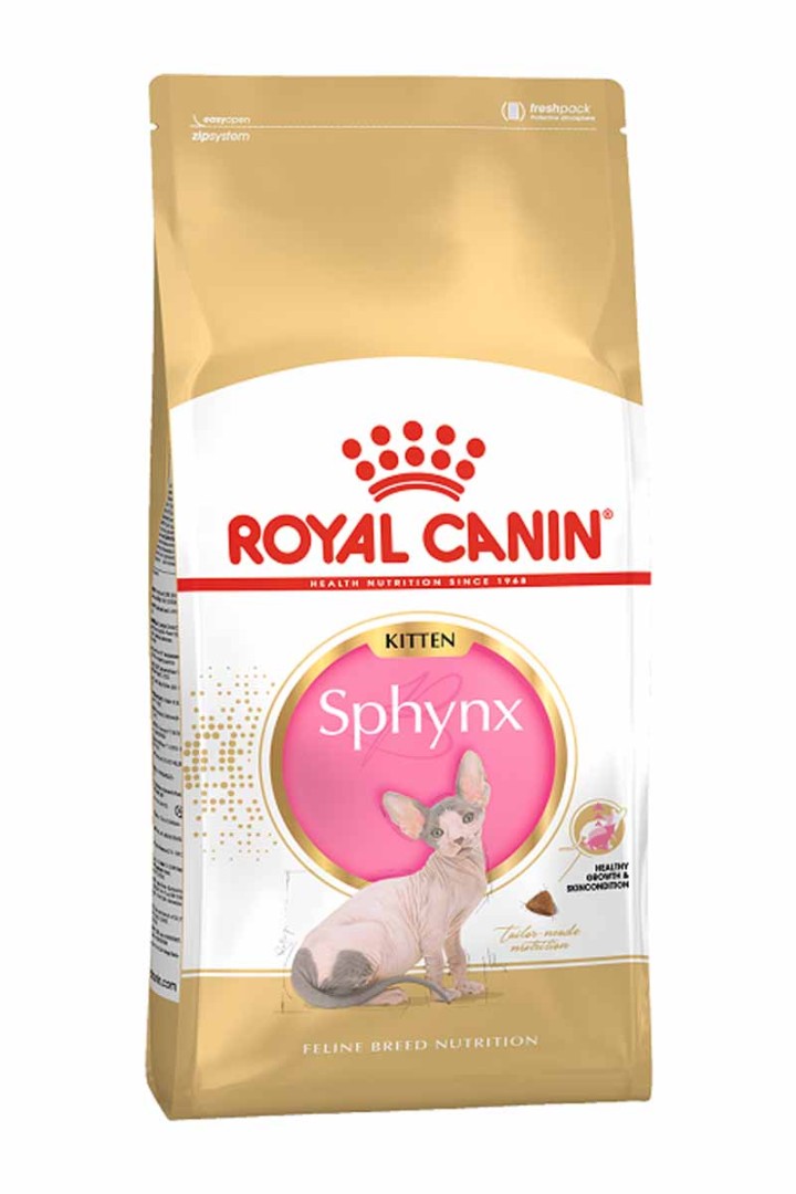 С раннего возраста котят сфинкса отличает характерная для породы челюсть. Для правильного питания требуются крокеты соответствующего размера и формы.- Специально для челюстей сфинксаЭти мелкие крокеты треугольной формы специально адаптированы по размеру и текстуре для челюстей котенка сфинкса. Уникальные крокеты побуждают тщательно разгрызать корм, способствую поддержанию гигиены ротовой полости.