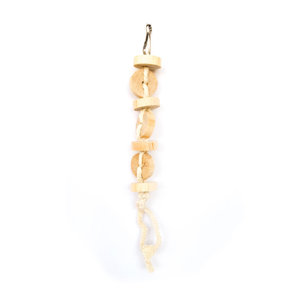 Игрушка для птиц с колокольчиком – популярная у птиц простая игрушка. Птички ппридумывают массу забав с такой игрушкой, а колокольчик внизу добавляет веселья. Крепится подвеска к верхней части клетки карабином. Материал: дерево, хлопок.