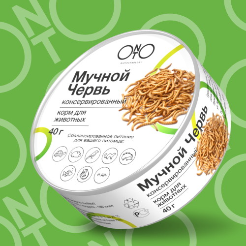 Мучной червь консервированный ONTO (Tenebrio molitor), 40гр. Мучной червь или «мучник» немного жирнее, а также более калориен, чем сверчок. Подходит для ежей, рептилий, птиц, грызунов, млекопитающих и рыб, а также других насекомоядных животных.