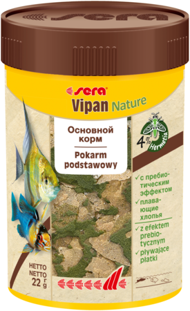 sera випан Nature - это основной корм, состоящий из плавающих хлопьев без красителей и консервантов для всех декоративных рыб, питающихся на поверхности воды.
