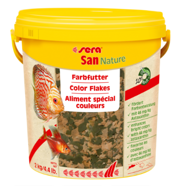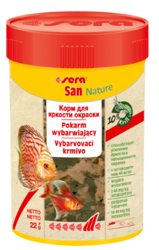 sera сан Nature - корм для яркости окраски без красителей и консервантов для всех декоративных рыб, питающихся на поверхности воды.