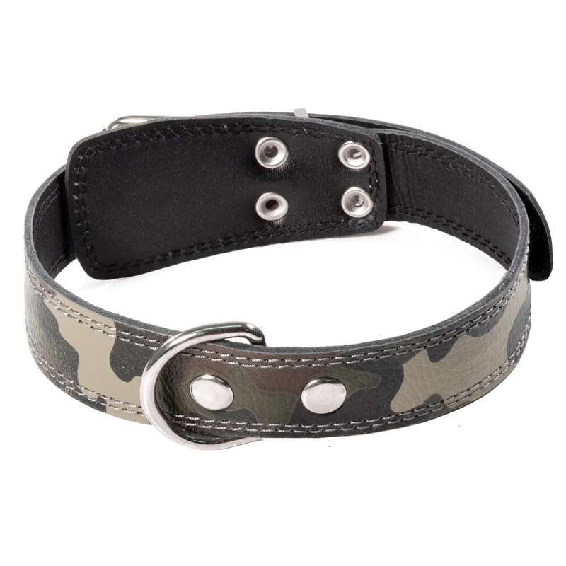 Этот ошейник - стильный кожаный аксессуар для больших собак весом 20-35кг., обхват шеи 55-60см. Варианты пород: английский бульдог (кобель), американский бульдог, стаффордширский бультерьер, питбуль, доберман, ротвейлер, аргентинский дог, родезийский риджбек. Изделие выполнено из мягкой кожи в оригинальной расцветке с использованием крепкой металлической фурнитуры. Предусмотренные отверстия позволяют удобно подгонять длину под индивидуальные параметры животного. Размеры изделия: 630мм*350мм*3мм. Цвет: хаки
