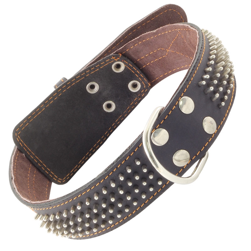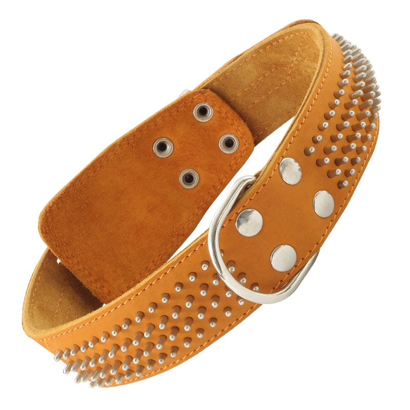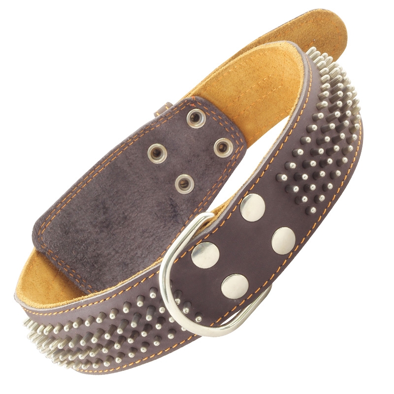 Толстый кожаный ошейник - незаменимый аксессуар для владельцев собак крупных пород. Изделие выполнено из мягкой, но прочной кожи высокого качества с использованием крепкой металлической фурнитуры в виде брутального декора. Предусмотренные отверстия позволяют удобно подгонять длину под индивидуальные параметры животного, а выносное металлическое кольцо отлично подойдет для надежного крепления карабина поводка, адресника или других аксессуаров. Размеры изделия: 770х45х5мм. Цвет: в ассортименте.