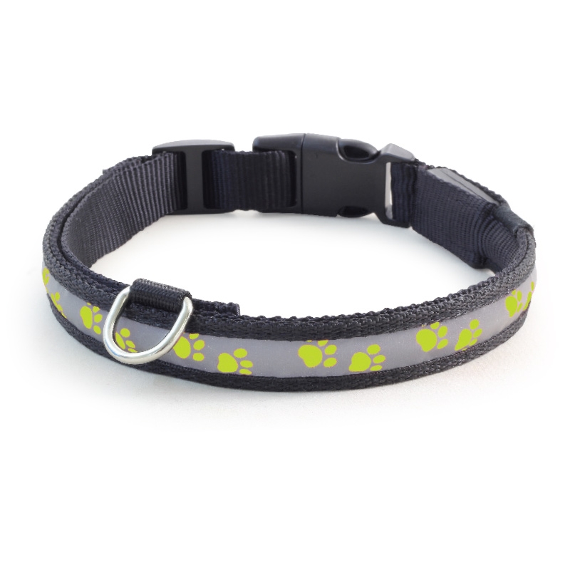 Светодиодный ошейник - это безопасность вашего питомца. Рисунок в виде следов лап. 3 режима свечения и 2 скорости мигания. Видимость в темноте в пределах 500м. Влагостойкая структура контроллера. До 200ч работы. Возможность замены батарейки светодиодного волокна. Цвет салатовый. Размер: 20*230-310мм.