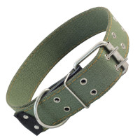 Двойной прошитый ошейник из брезента с кожаным подпряжником и прочным кольцом для крепления поводка или водилки. Такой ошейник отлично подойдет для собак крупных пород (размеры изделия в соотношении длина-ширина составляют 750х45 мм). Материал прочный и износостойкий, а длина изделия удобно регулируется.