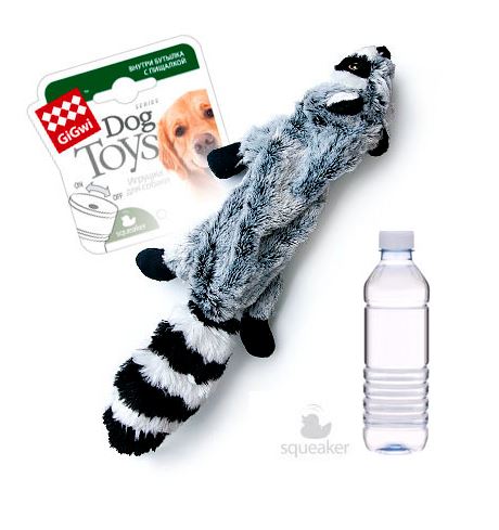 "Шкурка Енота", с пластиковой бутылкой, с пищалками в крышке, плюш. Отключаемая пищалка