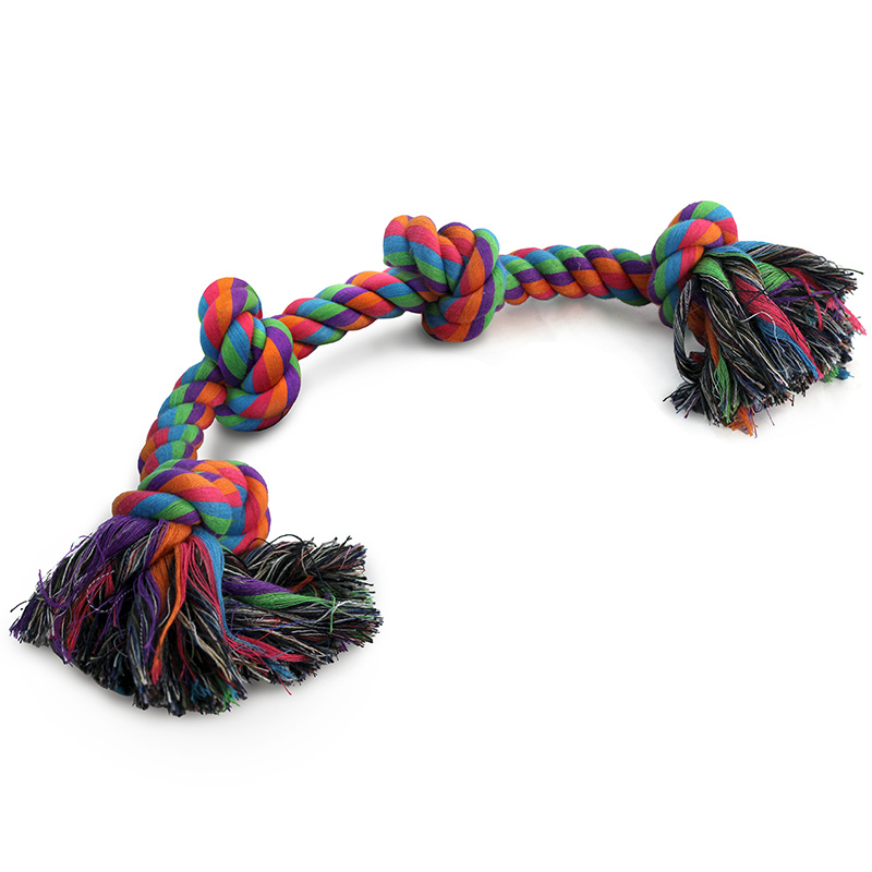 - Описание Собаки обожают играть с веревочными игрушками, так как их можно грызть, трепать и носить в зубах. Такие игрушки отлично массируют десны и очищают зубной налет во время игры. Веревки сплетены из нетей натурального хлопка, поэтому безопасны для здоровья Вашего питомца. Цвета в ассортименте. Вес: 330-340г. Длина - 540мм.