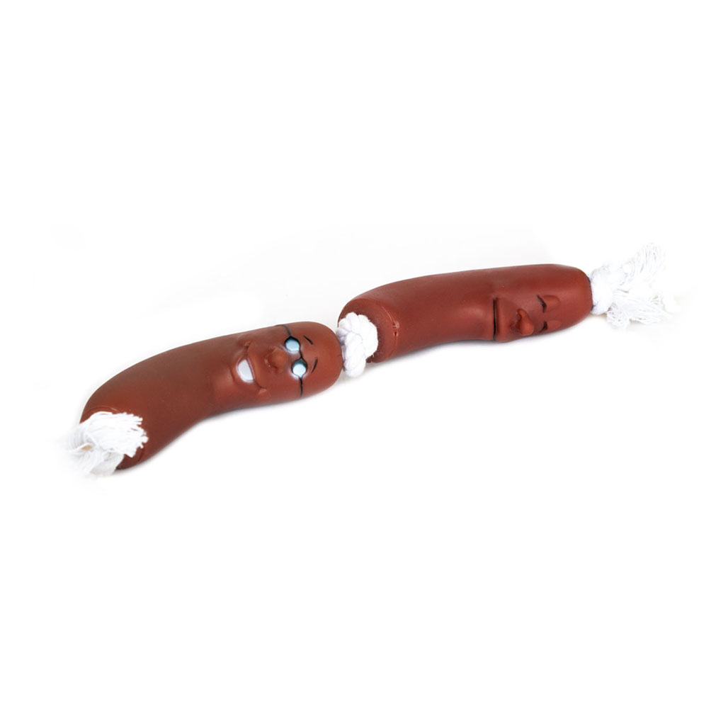 Виниловая игрушка "Сосиски виниловые на веревке". Игрушка выглядит как вкусные сосиски, состоит из крепкой хлопковой веревки и виниловых игрушек нанизанных на нее. Игрушка поможет развить моторику челюсти собаки и укрепить её зубы. Материал: винил, хлопок. Размер: 26 см