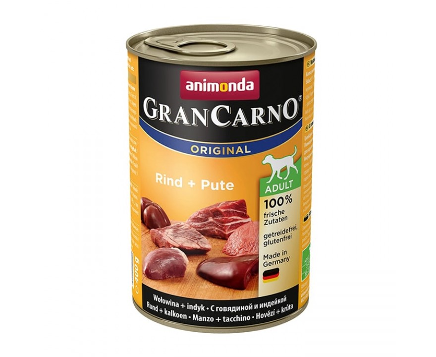 Animonda Gran Carno Original Adult (говядина, индейка) - сбалансированное, вкусное и здоровое питание на самом высоком уровне для взрослых собак 1-6 лет. Отобранное, свежее, мясное сырье гарантирует несравненный вкус, который собаки так ценят. GranCarno Original Adult обеспечивает взрослую собаку всеми жизненно важными питательными веществами.