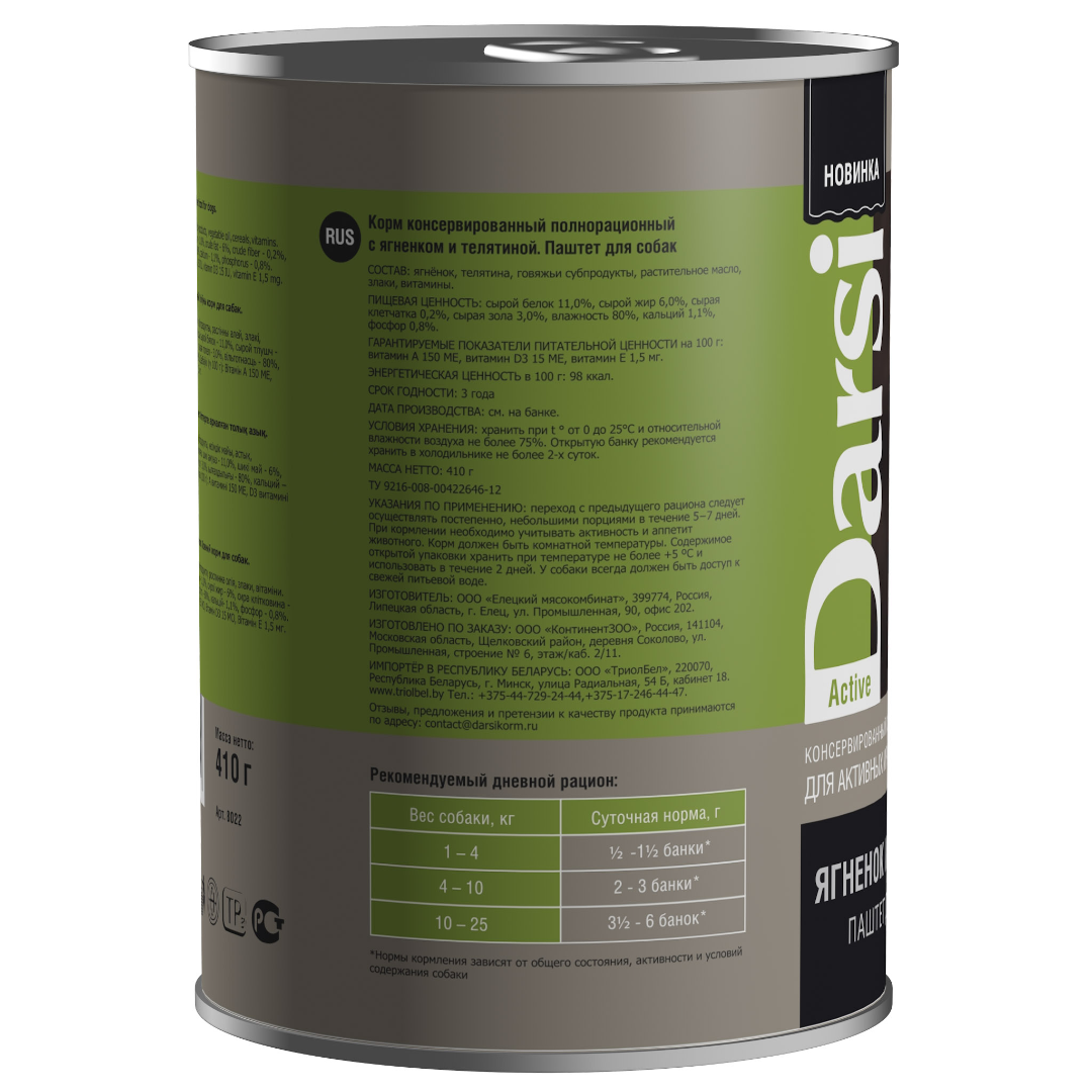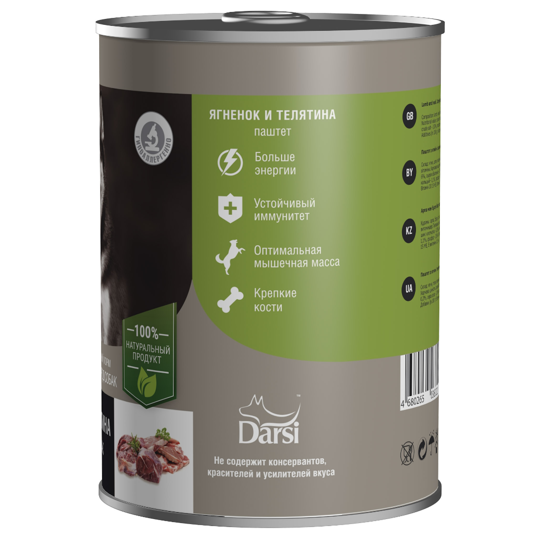 Состав: ягнёнок, говядина, говяжьи субпродукты, растительное масло, витамины. Гарантируемые показатели питательной ценности на 100 г: витамин А 150 МЕ, витамин D3 15 МЕ, витамин Е 1,5 мг.Аналитический состав: сырой белок 11,0%, сырой жир 6,0%, сырая клетчатка 0,2%, сырая зола 3,0%, влажность 80%, кальций 1,1%, фосфор 0,8%.Энергетическая ценность: 98 ккал. - Отзывы покупателей