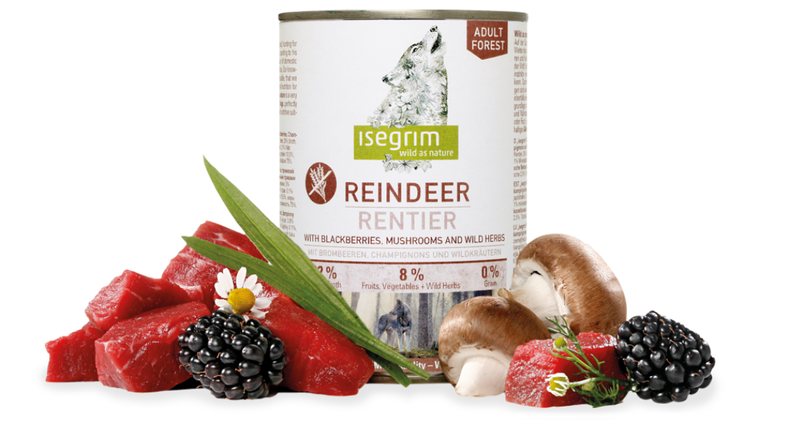 Состав: 63% мясо северного оленя, 29% бульон, 3,8% ежевика, 3% грибы, 1% минералы, 0,1% дикие травы, 0,1% лососевый жир.