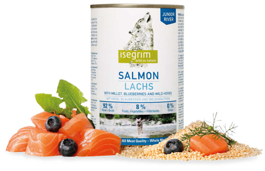 Состав: 54% мясо домашней птицы, 28% бульон, 10% лосось, 3,7% просо, 3% черника, 1% минералы, 0,2% лососевое масло, 0,1% дикие травы.