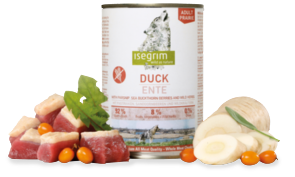 Состав: 33% утка, 30% мясо домашней птицы, 29% бульон, 3,8% пастернак, 3% облепиха, 1% минералы, 0,1% дикие травы, 0,1% лососевый жир.