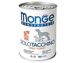 Консервированный влажный рацион Monge Monoprotein Solo Turkey - аппетитный паштет для собак из мяса домашней индейки, который рекомендуется как для ежедневного питания, так и в качестве основы исключающей диеты для питомцев с пищевой аллергией.