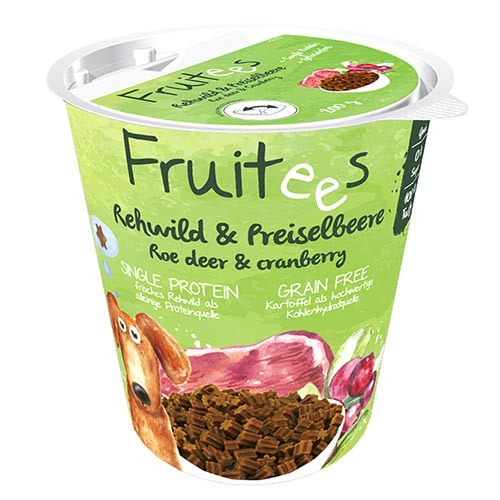 Фруттис с мясом косули и брусникой - это вкусный, сочный корм(в форме звездочек) с минимумом 20% свежего мяса птицы; он замечательно подойдёт вашему питомцу в качестве вкусной и полезной награды во время тренировки или любого другого случая. Ягоды брусники обеспечивают естественное антиоксидантное действие
