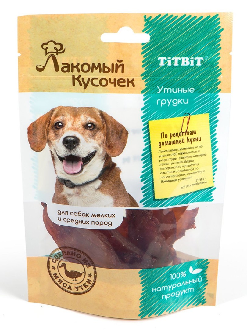 - Утиные грудки 60 г«Лакомый кусочек» - это новая линейка мясных лакомств для собак, которые изготовлены из натуральных ингредиентов по рецептам домашней кухни. Благодаря этому продукция является не только вкусной, но и исключительно полезной. Угостите «Лакомым кусочком» своего питомца, и он почувствует Вашу любовь и заботу, а его реакция на угощение расскажет Вам о достоинствах нашего продукта гораздо больше нас.
