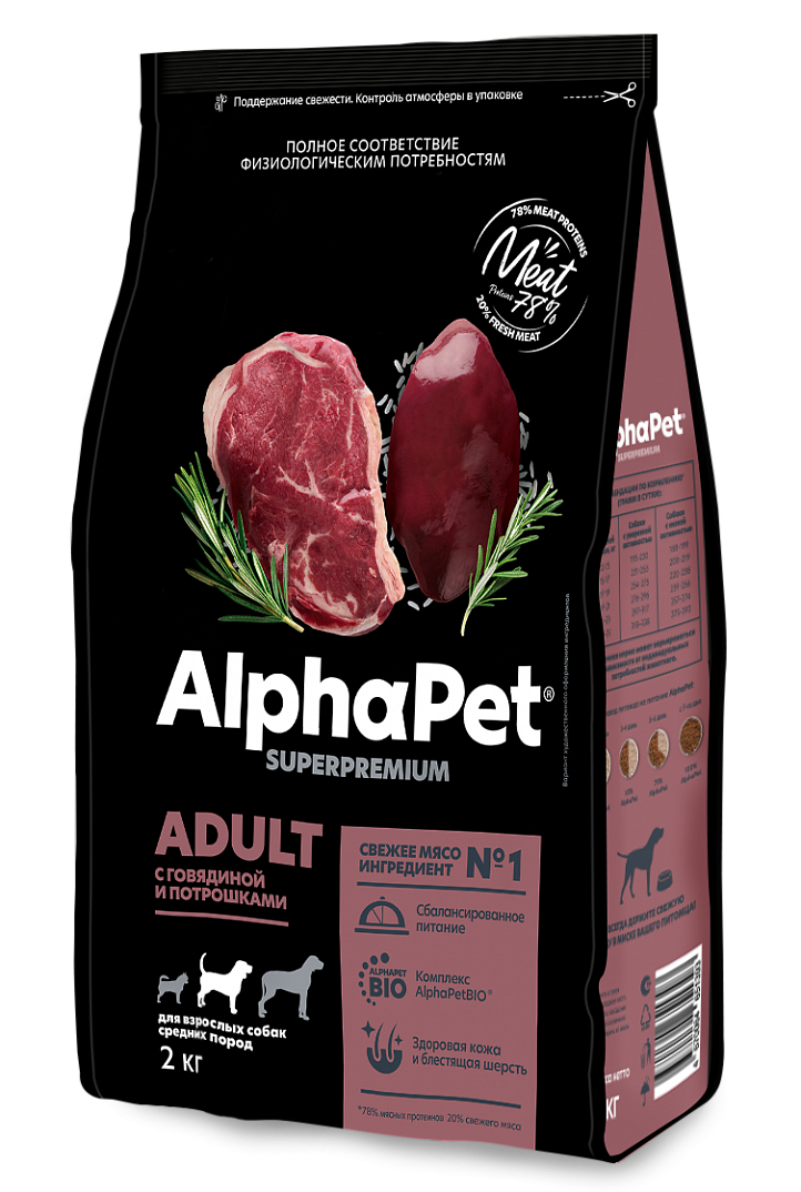 AlphaPet Superpremium / Сухой полнорационный корм с говядиной и потрошками для взрослых собак средних пород - 78% мясного белка