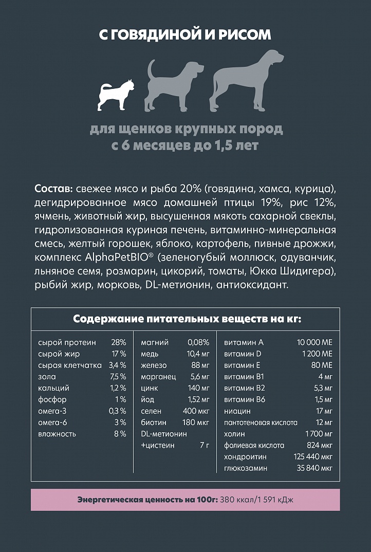 - Баланс кальция, фосфора и витамина D для правильного формирования скелета. Высокий уровень белка для нормального развития мышечной массы.