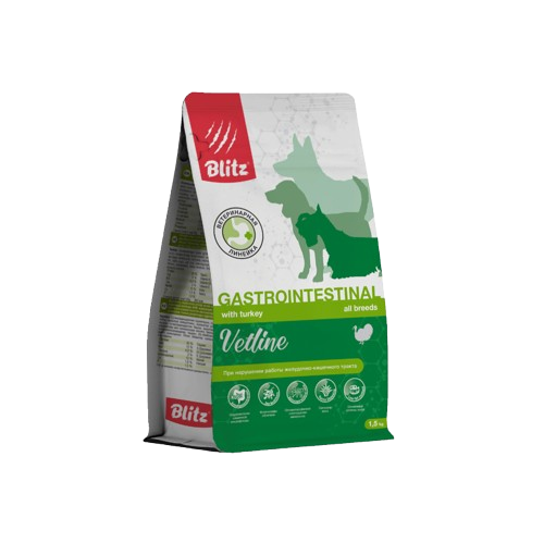 Полноральное кормление Blitz Gastrointestinal с индейкой, разработанное для собак, у которых имеются проблемы с желудочно-кишечным трактом.