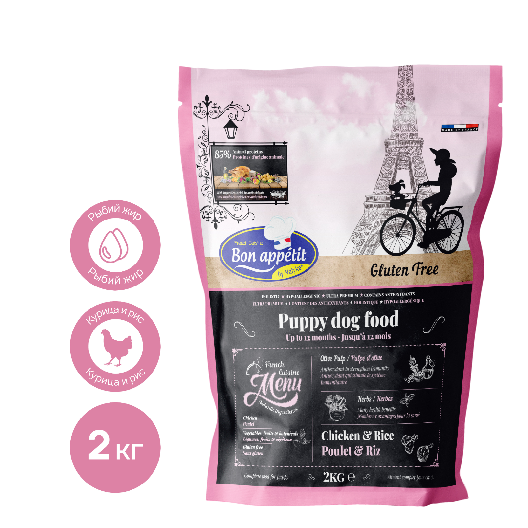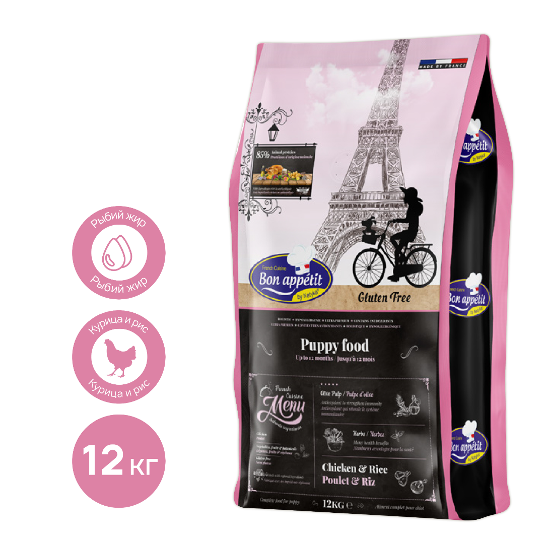 Bon Appétit Puppy - полнорационный корм супер-премиум класса для щенков всех пород. Корм содержит: 50% куриных ингредиентов, натуральные витамины, антиоксиданты, минералы и пребиотики. В составе оптимальный баланс кальция и фосфора, легкопереваримые ингредиенты и тщательно отобраннная смесь фруктов, овощей и трав, богатых витаминами и минералами для правильного роста и развития.
