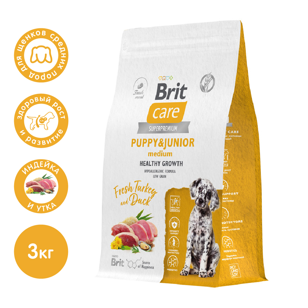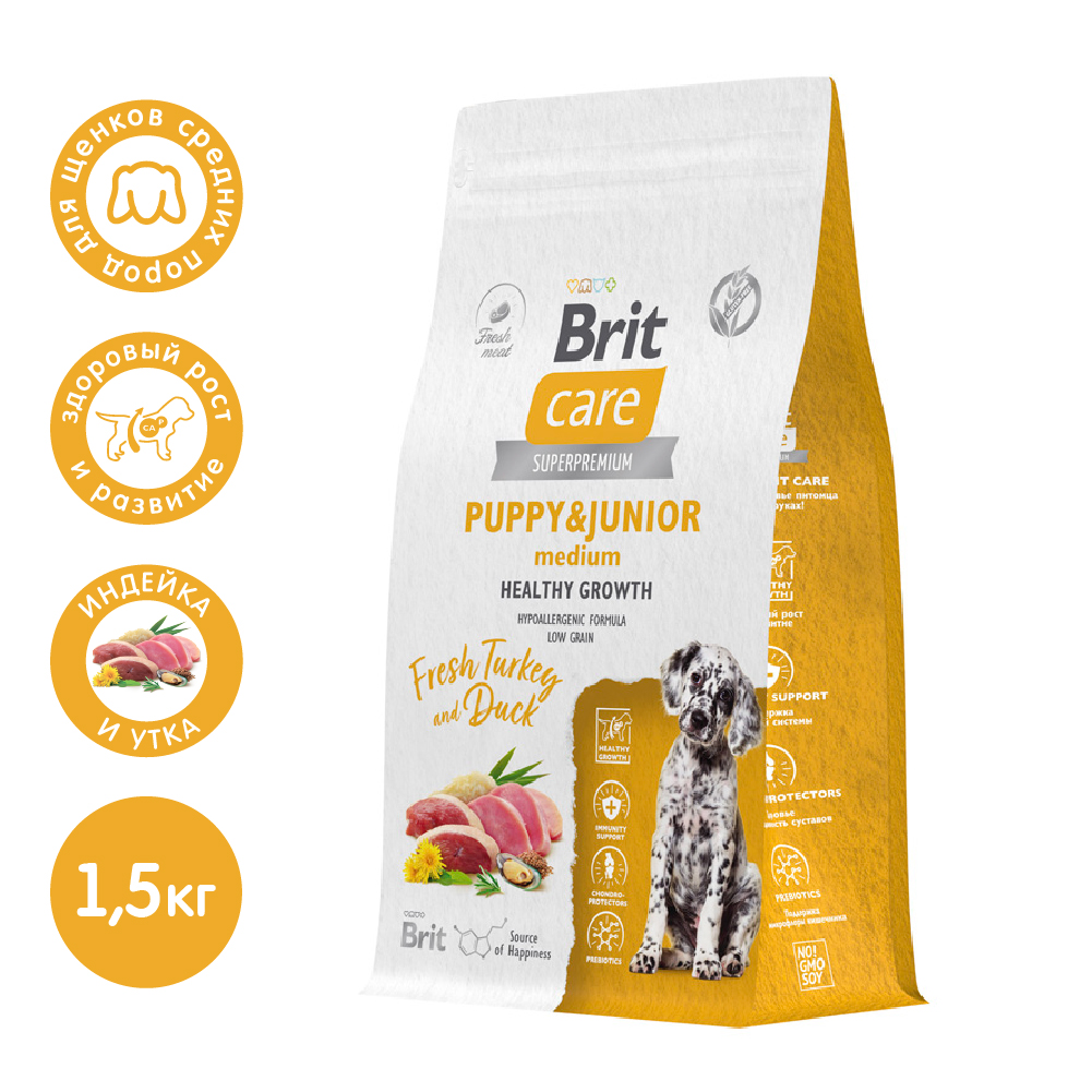 Полнорационный сухой корм суперпремиум-класса с индейкой и уткой для щенков и молодых собак и средних пород. Здоровый рост и развитие. Подходит для беременных и кормящих собак. Кальций, фосфор и коллаген обеспечивают полноценное формирование опорно-двигательного аппарата.